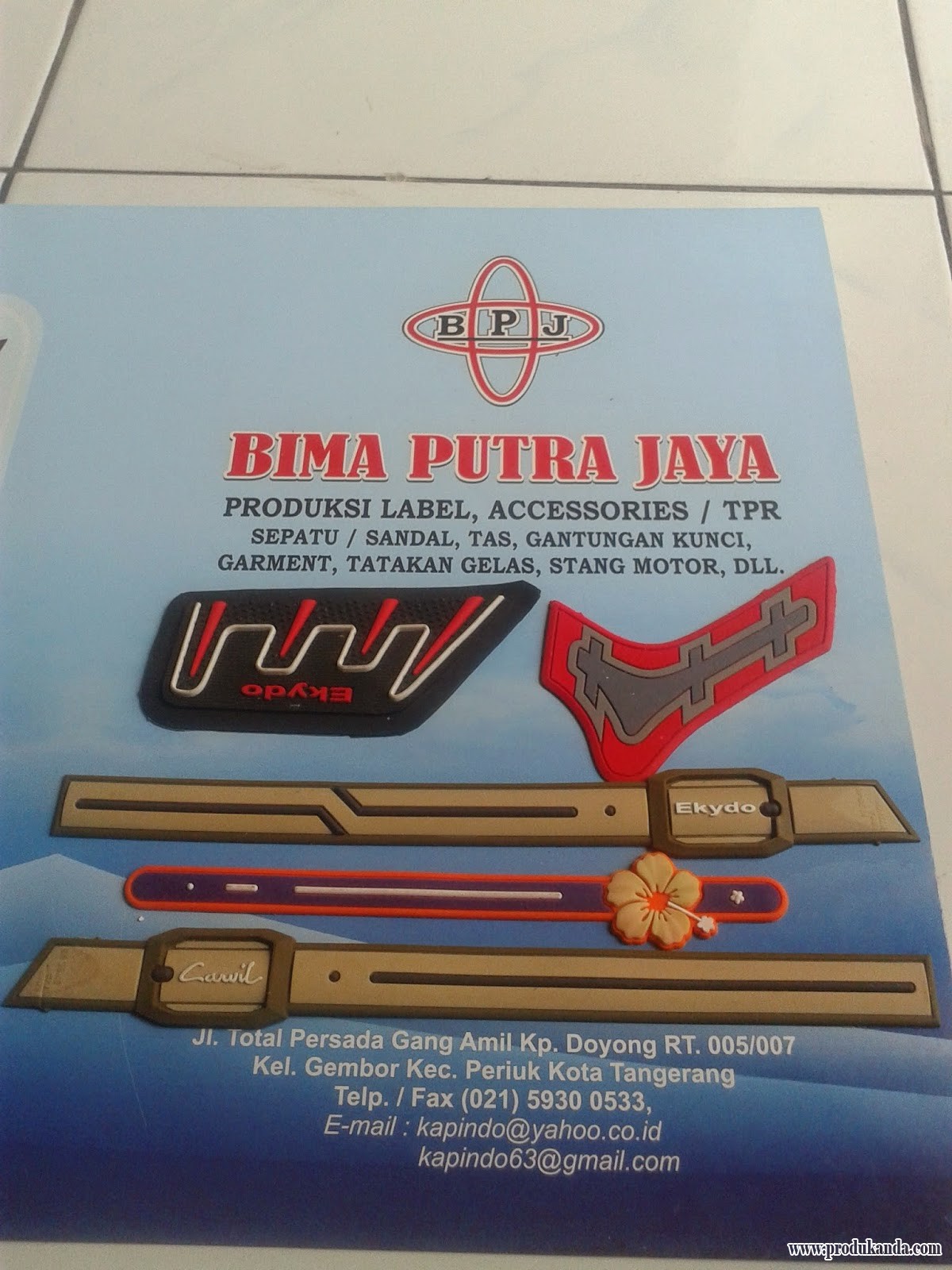 Kami adalah perusahaan yang bergerak dalam bidang pembuatan produk-produk yang berbahan dasar karet sintetis. Kami bermaksud menawarkan pembuatan label karet (TPR) untuk Accessories Sepatu, Sandal, Tas, & Gantungan Kunci. Gantungan Kunci banyak digunakan sebagai Souvenir pernikahan dan sarana promosi yang paling efektif. Kami mampu menerima pesanan dalam jumlah yang besar, dan proses produksi yang cepat dan harga yang terjangkau.